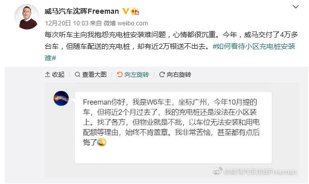 上个月也曾有威马车主向威马汽车创始人沈晖抱怨,购车后小区无法安装充电桩,“甚至都有点后悔了”。