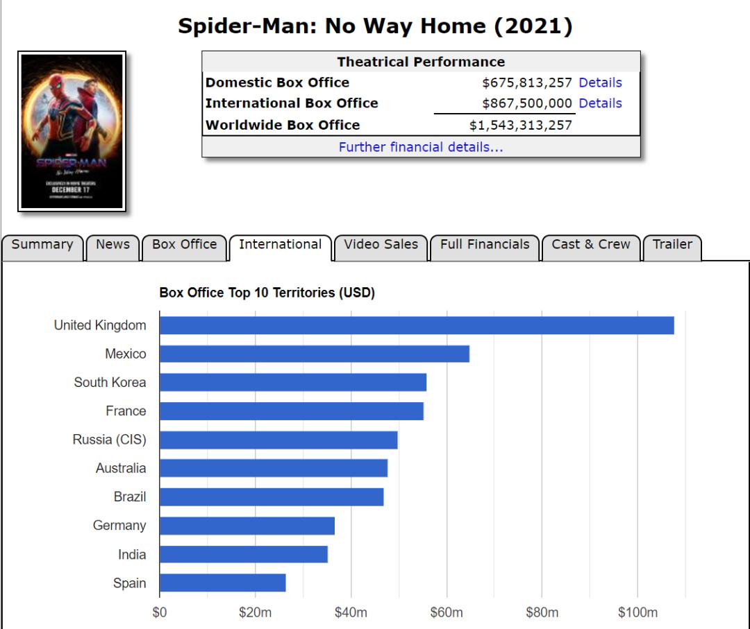 与本土相比, 《蜘蛛侠:英雄无归》在海外更是气势如虹:据comScore统计,《蜘蛛侠:英雄无归》在64个国家和地区进帐9742万美元,在国际市场同样完成四连冠;截至1月9日,《蜘蛛侠:英雄无归》海外票房达到8.68亿美元,最终突破10亿大关只是时间问题。
