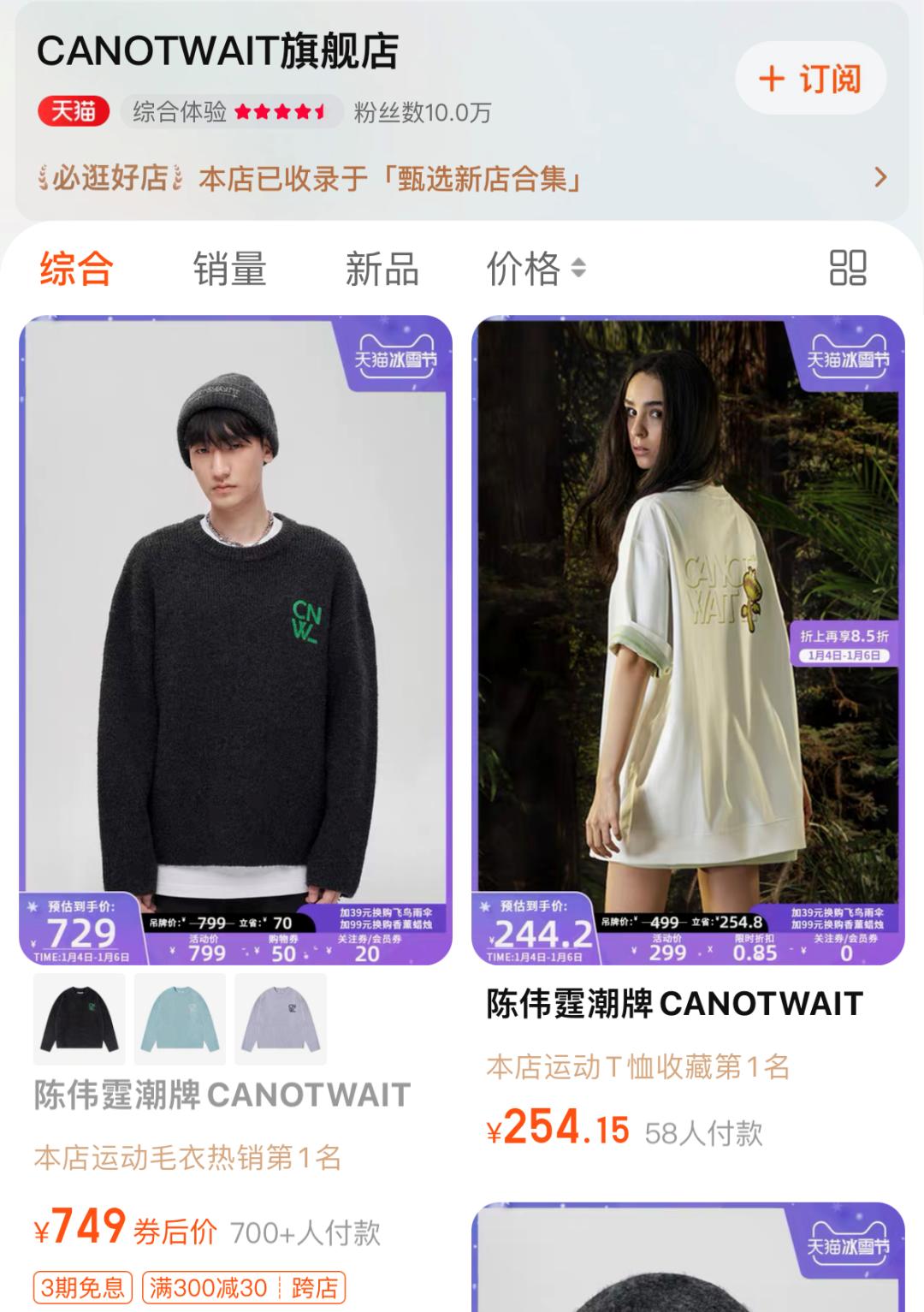 打开CANOTWAIT_的官方旗舰店,近期月销最高的一款服饰达到了700+,是一件胸前一处印花logo的套头毛衣,标价为799(券后749)。虽然旗舰店只有十万人关注,品牌也推出一段时间了,但一款衣服仍能在一个月内营收五十余万已经是个不错的成绩。