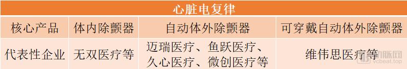 目前,心脏电复律相关企业包括体内除颤器(ICD)、手动体外除颤器、自动体外除颤器(AED)、可穿戴自动体外除颤器(WCD)。
