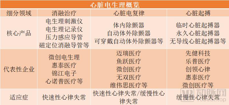 根据上文所述,心脏电生理领域主要包括导管消融、心脏电复律、心脏起搏等细分领域。其中,导管消融主要关联消融设备、消融导管、心脏标测系统、标测导管、电生理刺激仪、电生理记录仪等医疗器械及耗材;心脏电复律主要关联体内除颤器(ICD)、手动体外除颤器、自动体外除颤器(AED)、可穿戴自动体外除颤器(WCD);心脏起搏主要关联心脏起搏器。