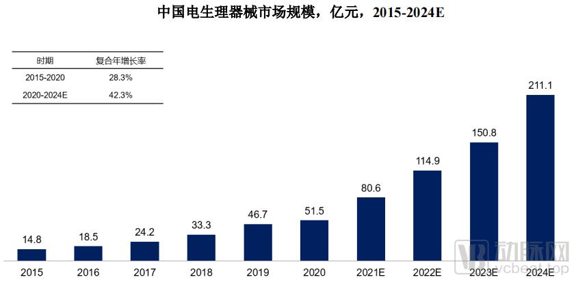 基于庞大的患者基数及迅速增长的手术量,心脏电生理器械市场规模也已从2015年的14.8亿元增长至2020年的51.5亿元,复合年增长率为28.3%,预计到2024年将达到211.1亿元,复合年增长率为42.3%。