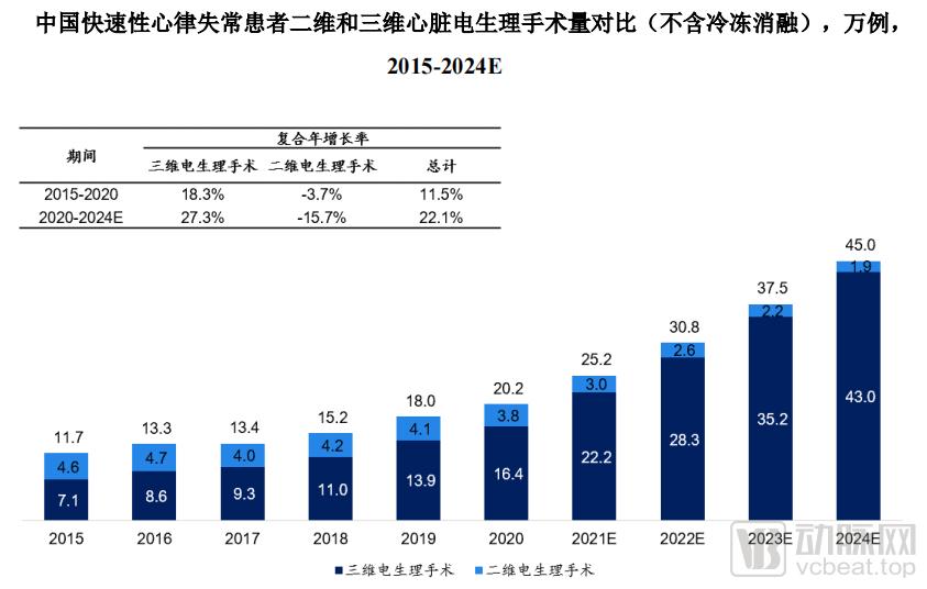 基于三维消融手术的多种优势,其应用数量呈逐年增长态势。根据《中国心脏电生理器械市场研究报告》,三维心脏电生理手术已从2015年的7.1万例增长到2020年的约16.4万例,预计到2024年将达到43万例。