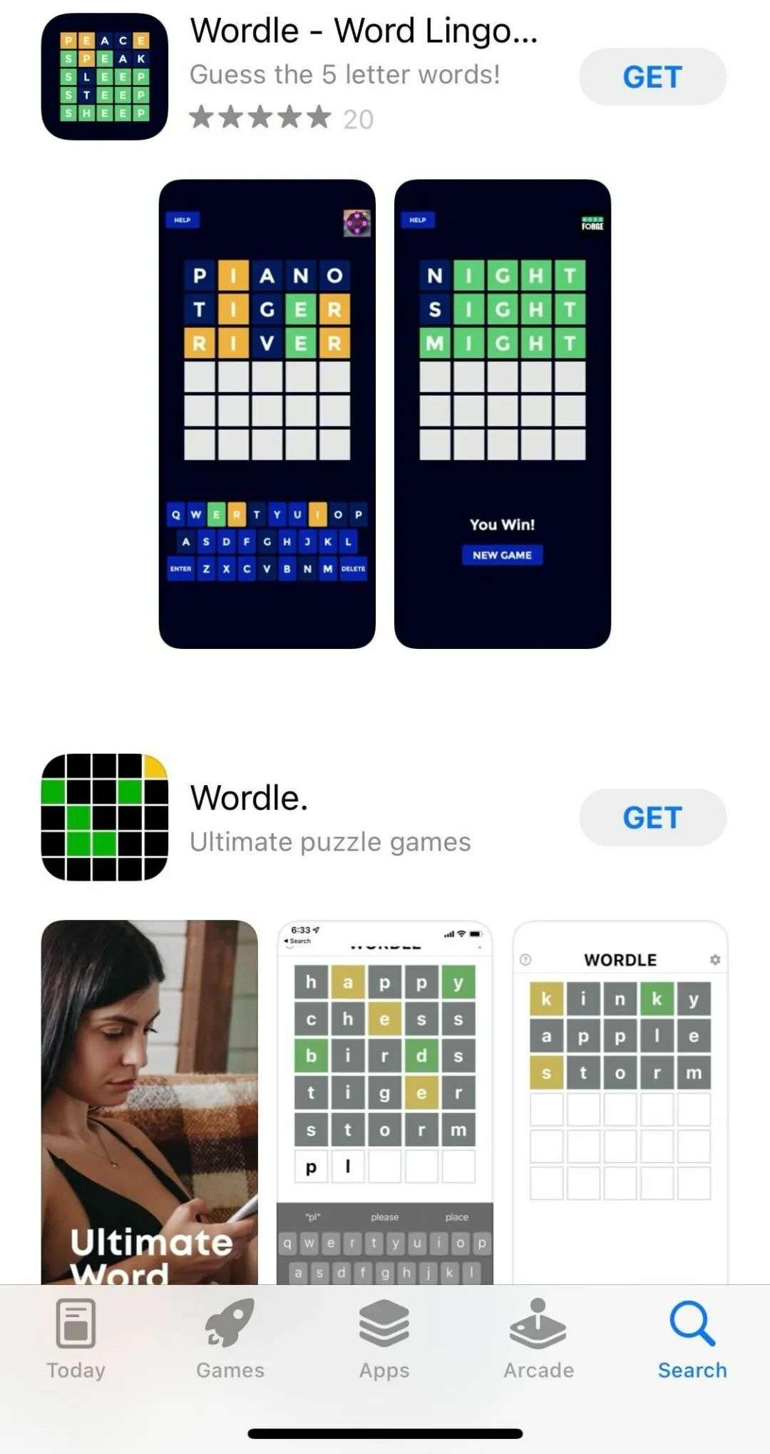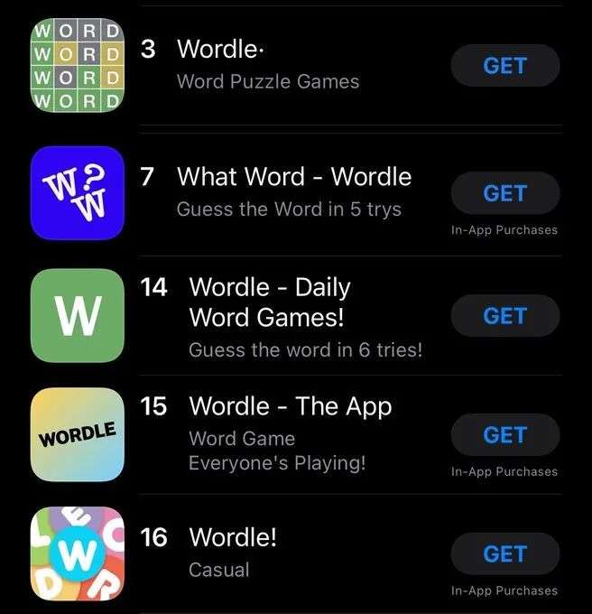 这肯定会招来一大堆李鬼:这些“李鬼”通常以 “Wordle”作为游戏名称、标题或搜索关键字,并且在游戏功能上,对正版游戏还原得可说是“原汁原味”……