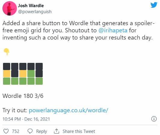 不过在去年12月,有一位玩家 @irihapeta 想出了一个奇思妙招,能够让玩家既不泄题,也能分享他们的游戏结果——甚至,这种分享方式还带有一点“神秘感”,对于那些看到了分享内容却不知道个中秘密的人,更是吊足了胃口: