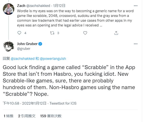 “你在 App Store 上能找到不是孩之宝开发的,还敢叫 Scrabble 的游戏?你个**。也许会有和 Scrabble 机制类似的游戏,没准你能找到上百款这样的,但没有一款不是孩之宝开发的游戏敢叫自己 Scrabble 的。”