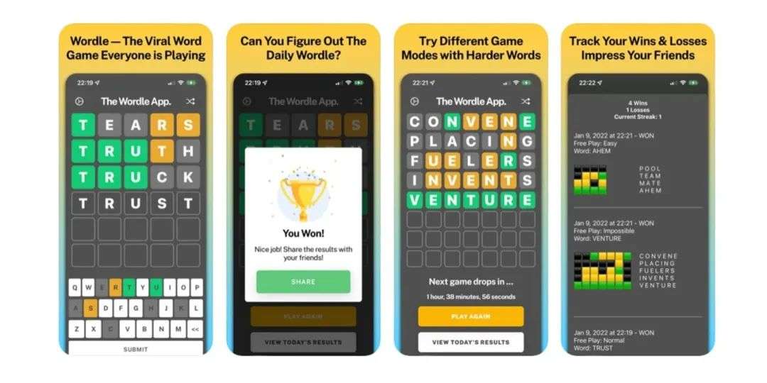 按照 Shakked 自己说的,他是在看到 Wordle 这个游戏火了之后,发现它并没有 app 版本,于是在上周末自己直接用最快的速度复刻了一个 app 版本出来。