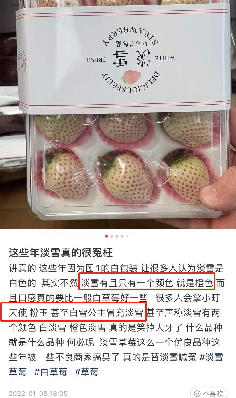 有人解释道,淡雪不好吃,是因为市面上有的商家会用其它白草莓冒充“淡雪”。