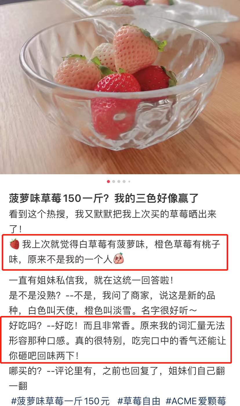 上周有条热搜,一斤菠萝味白草莓卖到150元。网友表示震惊:“吃草莓不就是为了草莓味儿,喜欢菠萝味的话,我买10块钱一盒的鲜切菠萝不香吗?”