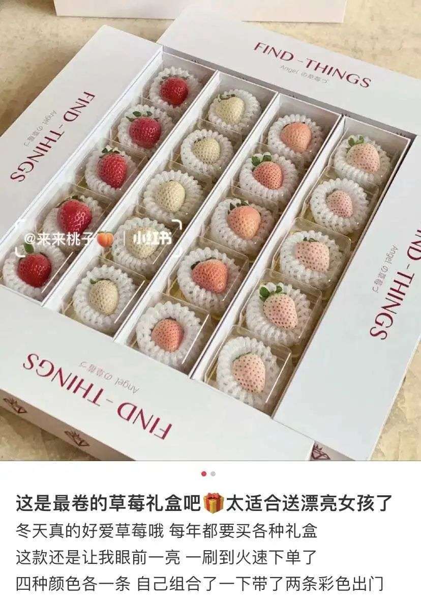 但当白草莓一出场,瞬间秒杀以上所有。在价值300元+的四色草莓礼盒里,红草莓只是边缘配角,“白富美”白草莓才是主角。