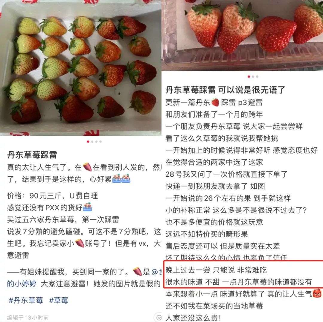 对比之下,网购来的丹东大草莓,很容易踩雷。有不少网友晒出了自己网购丹东草莓踩雷的经历。