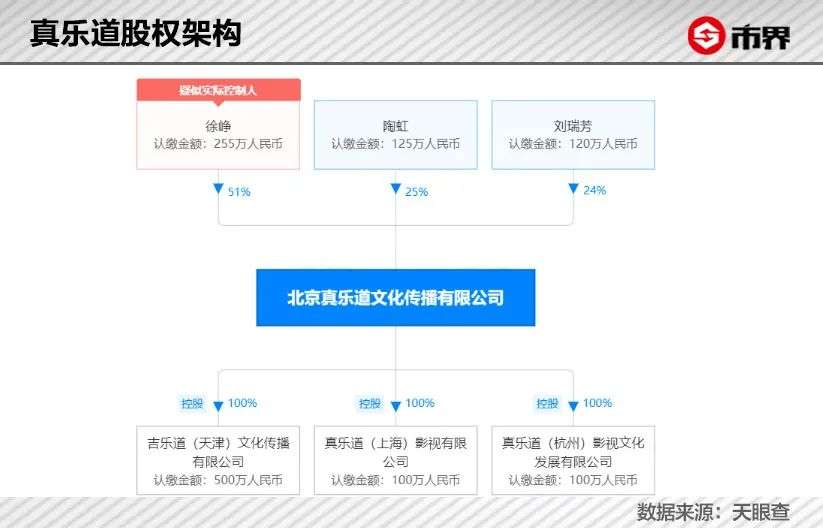 这家成立于2012年的影视公司,创始人为徐峥、陶虹和刘瑞芳,三人的持股比例分别为51%、25%、24%,其中,陶虹是徐峥的妻子,刘瑞芳是其经纪人。从持股比例来看,徐峥是真乐道的实控人。