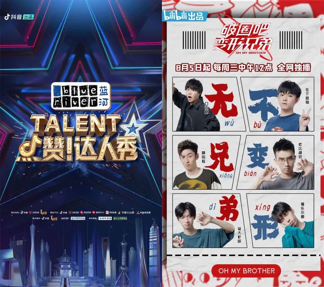 其次是明星达人生态,不但和诸多明星形成了稳定合作关系,平台达人也可以在节目中发挥作用,比如抖音的《点赞!达人秀》就和达人深度联动,B站也有《UP主变形记》《破圈吧变形兄弟》等多档UP主真人秀。