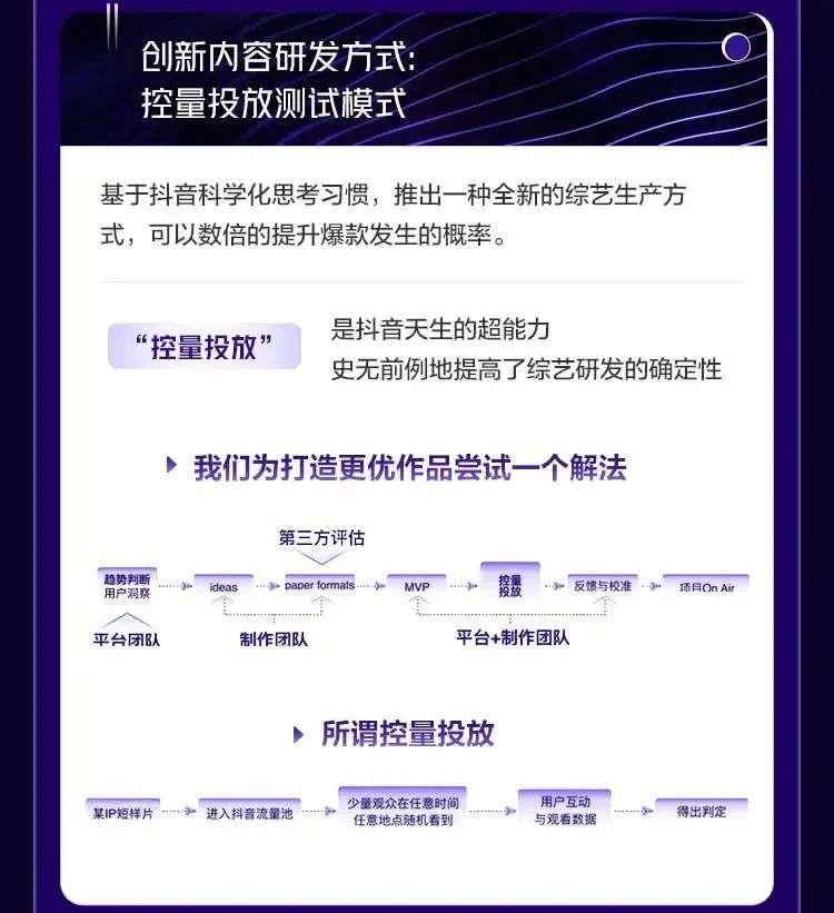 还有同时提出的“控量投放”,结合抖音的优势提出了一种“提升确定性”的生产方式,并基于此推出了战略级综艺《百川综艺季》,针对综艺痛点的打法吸引了行业内不少关注。