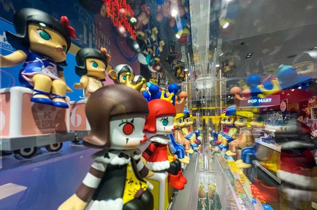 在泡泡玛特零售门店,消费者能看到一个亚克力架里五彩斑斓的娃娃像模特一般被展示出来,门店店员会和蔼可亲地走过来说,“对不起,这一系列的娃娃正在补货中”。