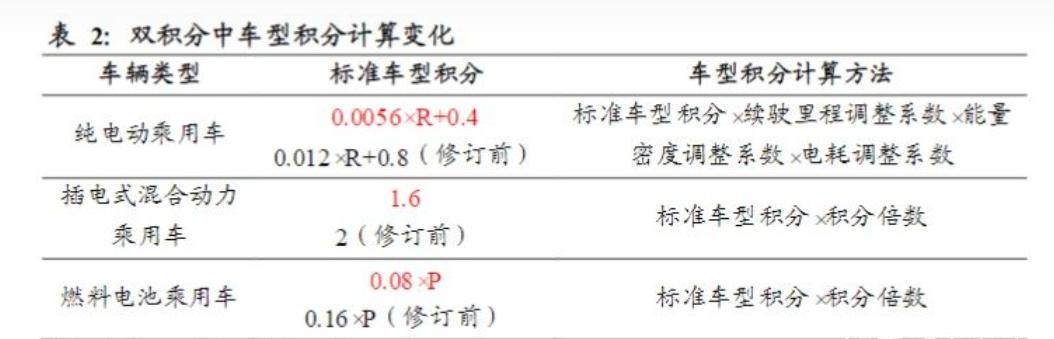 例如在2020年6月工信部发布的《双积分办法》修订版,其将纯电动乘用车积分里程系数从0.012下调至0.0056,并将纯电动积分上限由5分下调至3.4分,插电式混动乘用车积分上限由2分下调至1.6分。