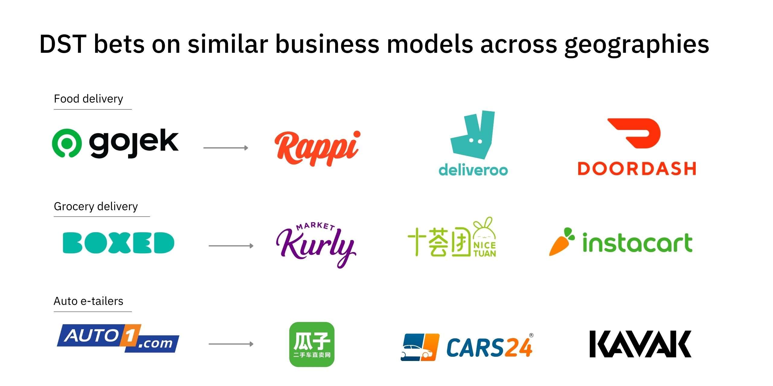 比方说,一旦 DST 确定外卖配送这种模式可行,在投资完印度尼西亚的Gojek之后,它没有停下搜寻猎物的脚步,而是继续投了哥伦比亚的Rappi 、欧洲的 Deliveroo 以及美国的DoorDash 。