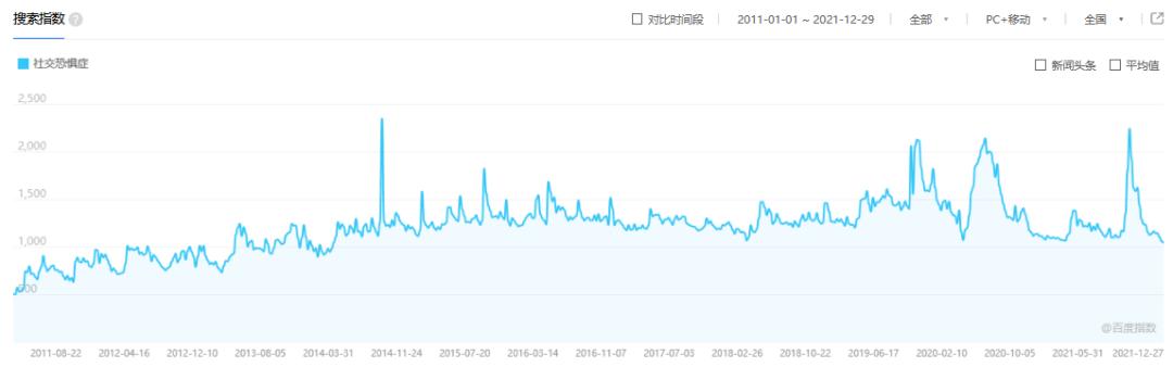 看看近10年来,社交恐惧症的搜索指数,基本处在均匀上升状态。在19、20、21年,还分别有几波持续较长的搜索高峰。