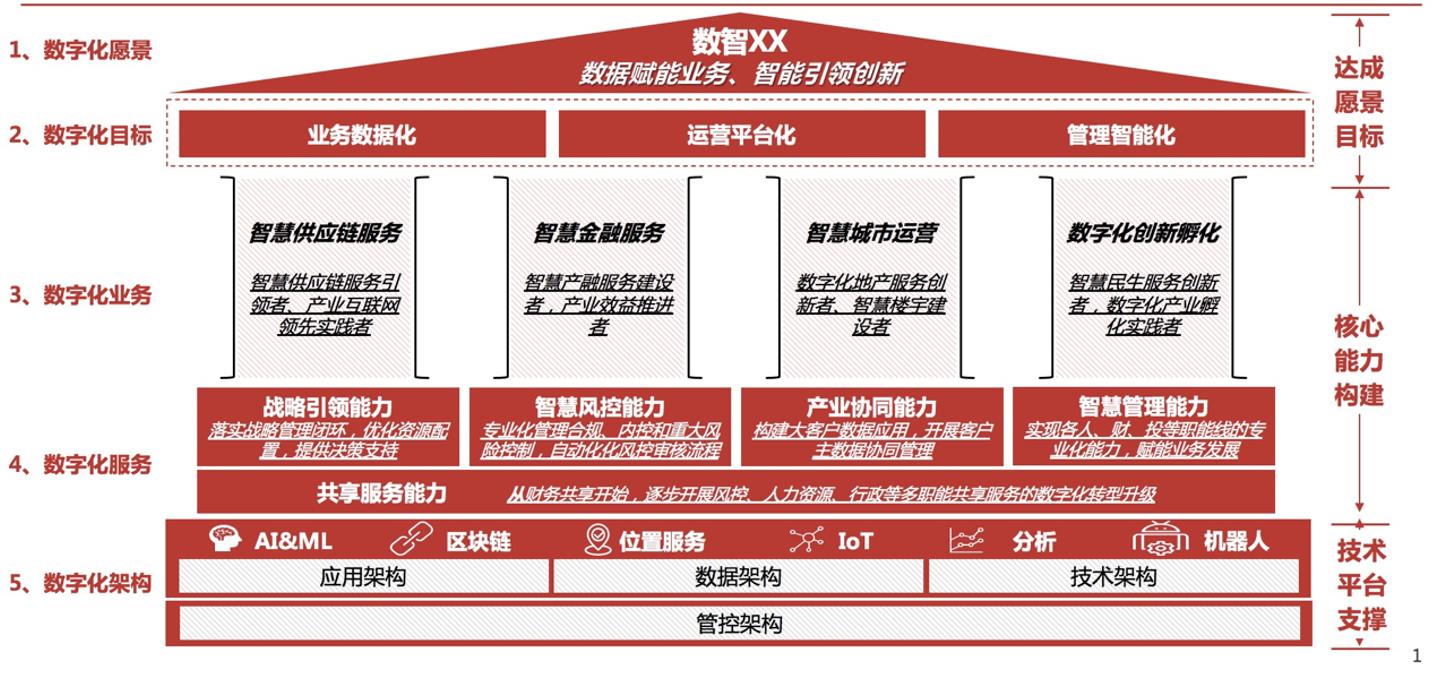 数字化蓝图规划是为了对转型指引发展方向、明确发展原则、确定发展定位、指明发展目标,找准工作抓手,主要包含自上而下的五个层面,即数字化愿景、数字化目标、数字化业务、数字化服务、战数字化架构。上层明确方向与思路,下层为战略实施提供支撑,构成有机发展战略。