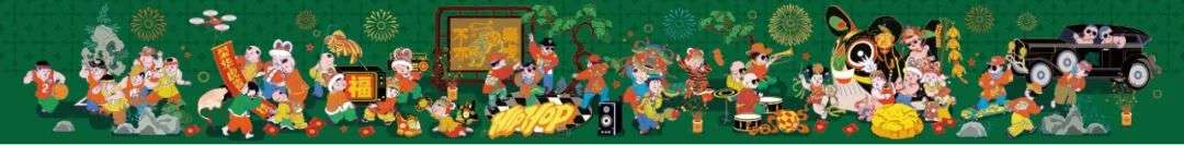 泸溪河“虎福新春礼盒”的灵感来源于中国古代名画“百子迎福”。设计师将百子图改成百子迎虎图,象征着虎年福气多多,大虎大贵。画面中的元素纵贯古今,每组孩子都融入了虎的元素,借虎福祝大家新年虎虎生威不亦乐虎!