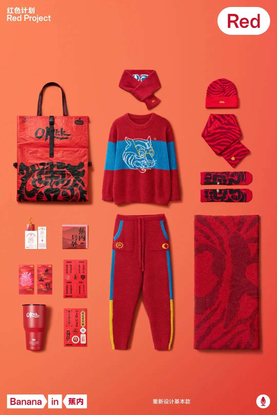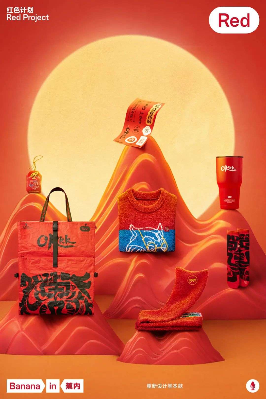 蕉内以“虎山行”为题,邀请跨媒体艺术家朱敬一、新锐街头艺术家Fansack两位大咖特别创作,将红色新品以现代创意语言演绎,重新设计国人新年基本款。本次“虎山行”限量周边礼品,连名字都在花式玩梗,分别化身“招财虎”红包、“虎身符”好运符与“纸老虎”记事簿等,让用户在新年玩出新花样。