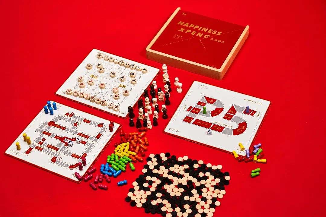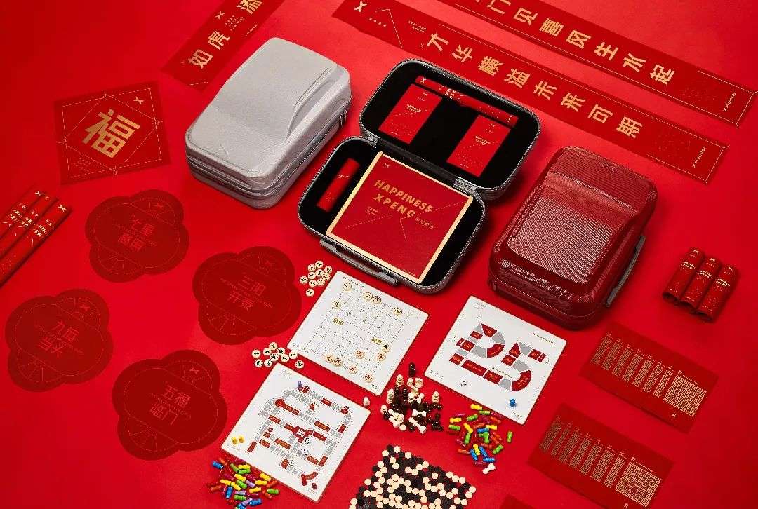 小鹏把一个行李箱作成了汽车的外形,设计源于G9车型。里面装了百变桌游、对联福字、窗花和红包,有鹏来兮,不亦乐乎!