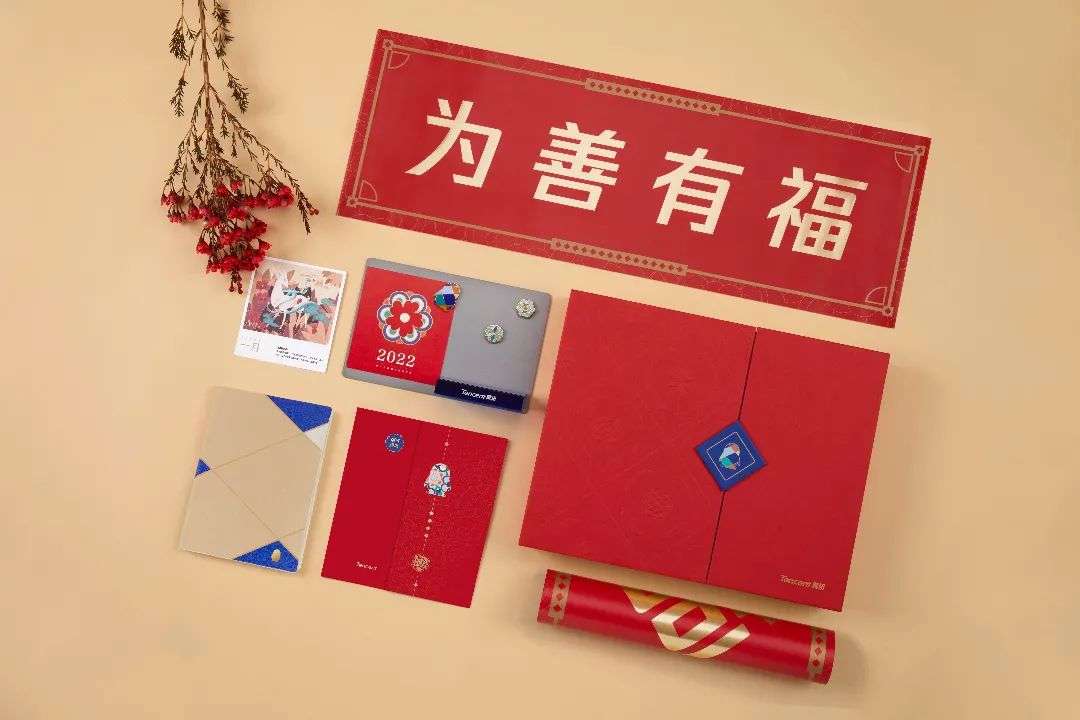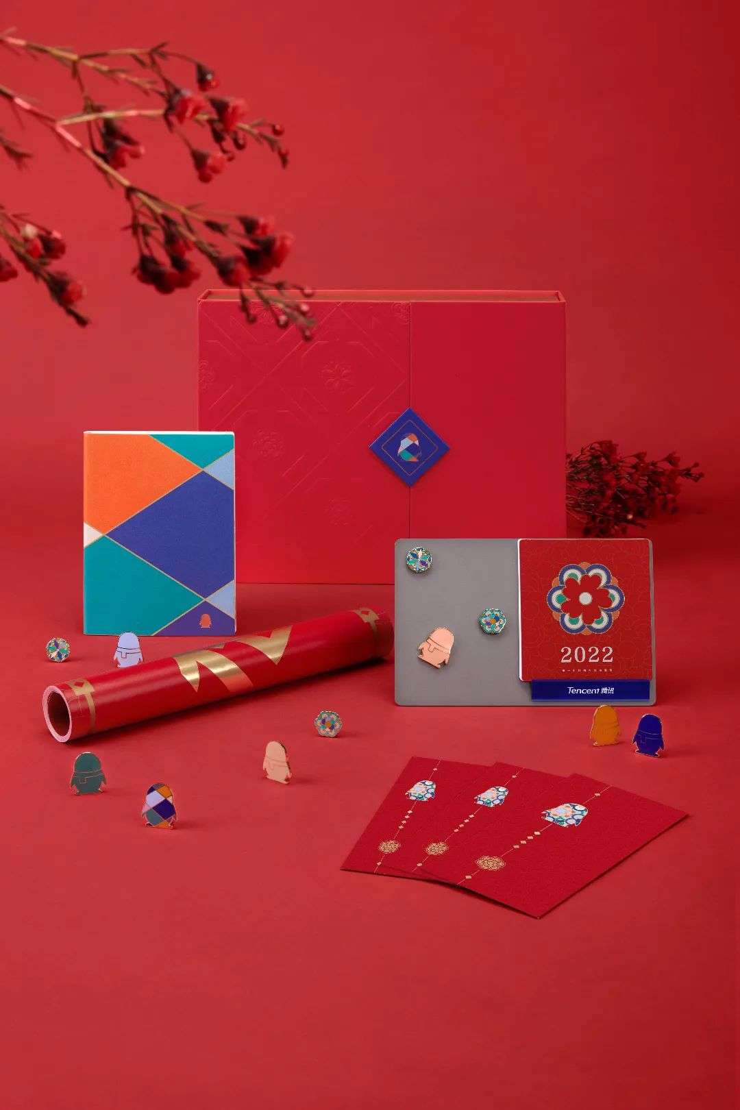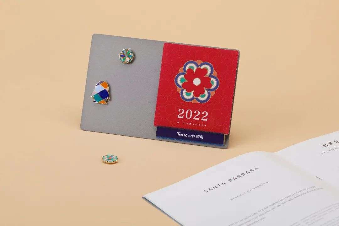 鹅厂今年的新春礼盒以公益为主题,延续“科技向善”的企业文化。除了红包和对联外,传统珐琅工艺打造的企鹅磁贴可以吸在一个磁吸式台历上。这个台历据说还能当小黑板用。更值得一提的是,月历的图画,来自传递爱心的小红花手绘公益主题,每月一个幸福故事。