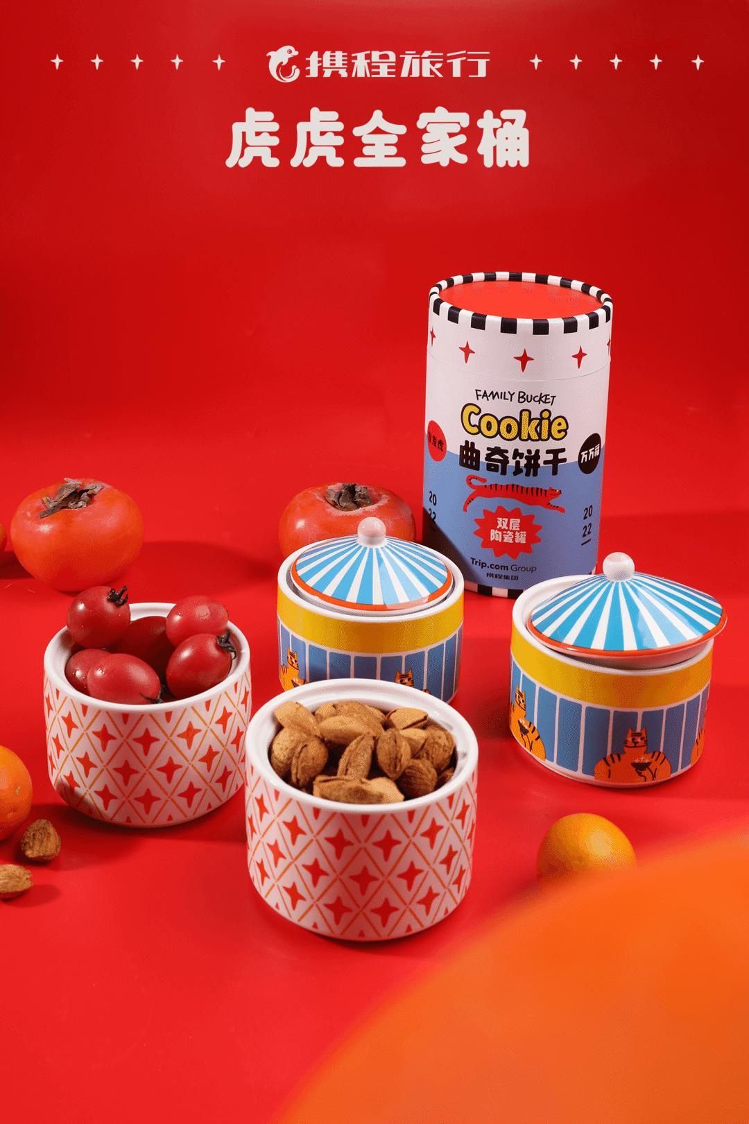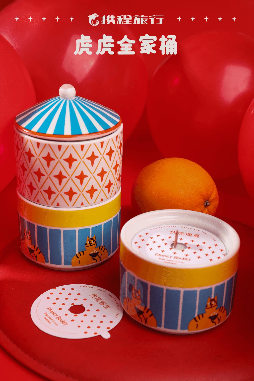 携程旅行的「虎虎全家桶」新年礼盒以「虎图腾」为设计灵感,用插画形象演绎虎文化。以「全家桶」为设计语言,结合春节欢聚时的用餐、分享场景,用披萨盒、薯片筒、饼干盒、铁皮桶,装点新年对联、红包、餐盘、贺卡、陶瓷罐(含香氛蜡烛)。