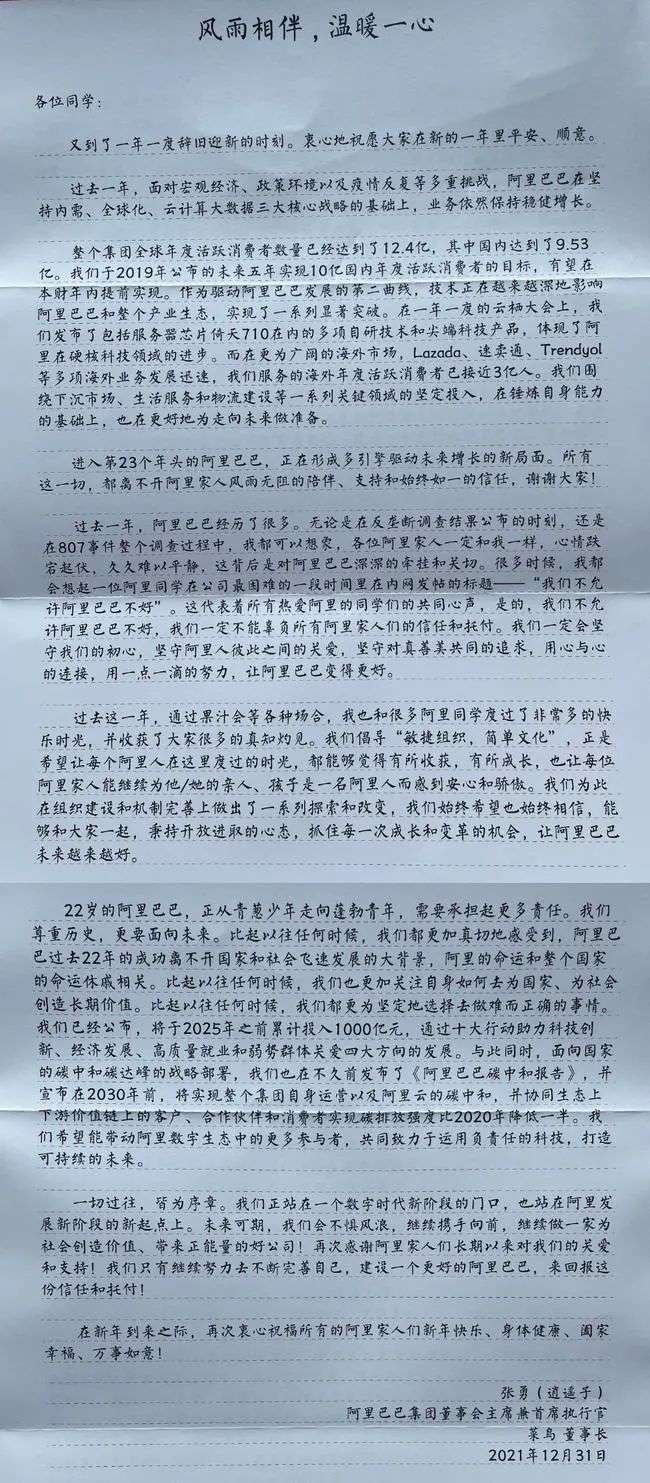 阿里今年给员工赠送的新年礼盒“阿里家书”,包含了一副对联、台历和玩偶,还有一封张勇写给员工的家书。这封信中,张勇特别提及了反垄断调查和“807事件”(即阿里巴巴女员工性侵案)。张勇表示一定不辜负员工信任和期待,让阿里巴巴变得更好。阿里借助员工家书的方式,重提两件对公司有重大负面的事件,体现了张勇的担当吧,起码没躲避,这是修复员工凝聚力所需要的。