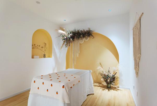 镜头切换,米黄和白色调的房间,干花和流苏沿墙垂下,正中间摆放着一张白色小床,阳光透过玻璃射进来,看起来像是圣洁的婚礼殿堂。