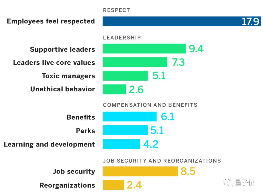 上图中列举了五个最大的离职原因,分别是有毒的企业文化、工作没有安全感、公司创新性太强、公司赏罚不分明、对新冠的应对比较差劲。