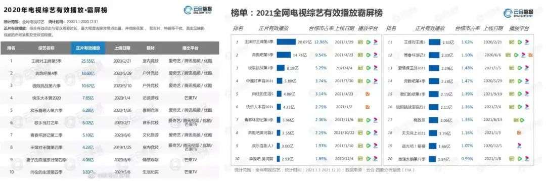 但与2020年、2019年相比,节目的有效播放量逐年下滑。以第一名《王牌对王牌》为例,去年《王牌5》有效播放量为25.5亿,今年《王牌6》降至20.07亿,《奔跑吧》《极限挑战》等老牌综艺IP的有效播放同样下滑。