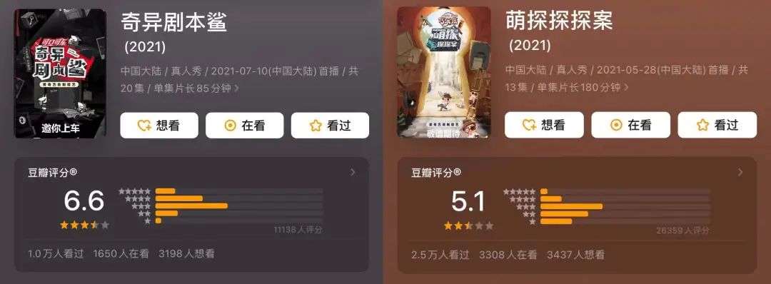 但从口碑来看,三档节目中评分最高的,是注重呈现剧本种类与经典玩法的《奇异剧本鲨》(6.6分),《萌探探探案》豆瓣评分只有5.1分,热门评论中,关于指责节目过度“借鉴”韩综、剪辑太乱、推理部分太弱的声音很多。而《最后的赢家》因观看人数不足,至今都未能开分。