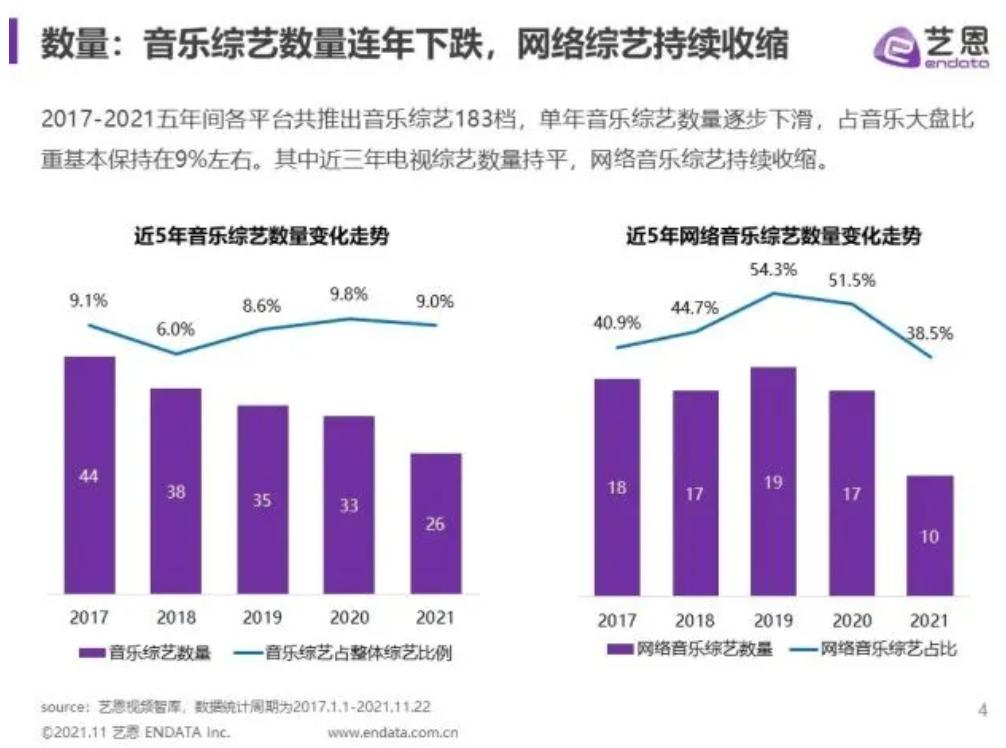 音综的颓势从头部节目上体现得尤为明显。艺恩数据的《2021音乐综艺市场研究报告》显示,2017-2021的5年间共有183档音综推出,但单年音综数量逐步下滑,其中头部音综爆款表现呈现乏力的态势,2018年位列年度TOP15的综艺中有5档音综,到了2021年TOP15中音综仅剩1档。