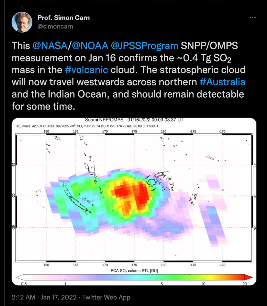 根据密歇根理工大学火山学家Simon Carn教授1月17日凌晨2点(格林威治时间)的推文,他引用了美国航空航天局NASA卫星测量数据,指出:截止16日,汤加火山喷发释放的二氧化硫含量为420.53千吨。