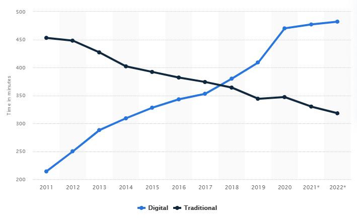 比如上图中浅蓝色的线条代表我们花在数字媒体上的时间逐渐增加,而黑色的线条则意味着我们花在传统媒体的时间逐渐减少。
