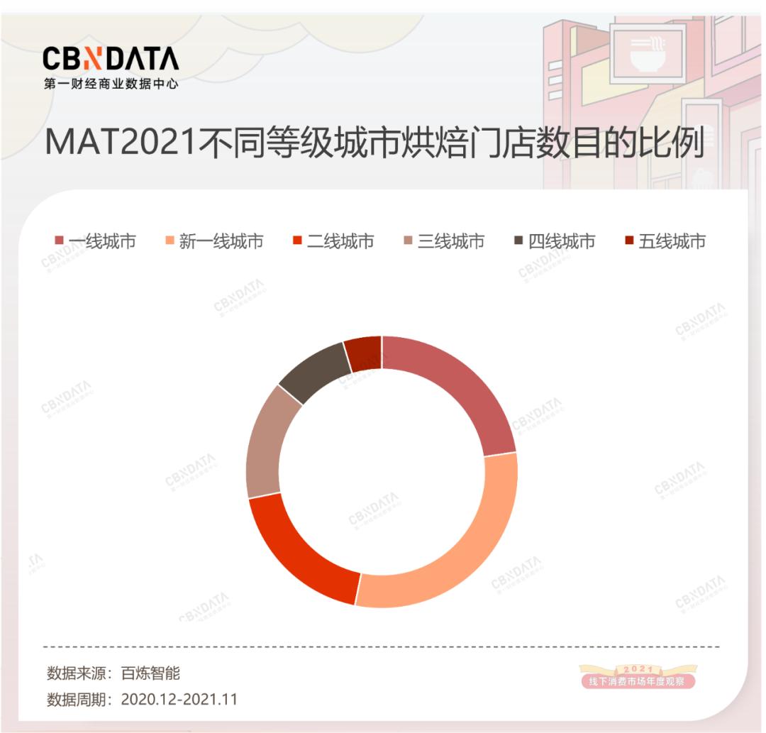 2021年,一线和新一线城市的烘焙行业仍旧保持着极高的成长活力。根据百炼智能提供的数据,在2021年,在一线和新一线城市中烘焙门店的开店率分别达到了160.92%和125.53%,远高于全国范围的121.32%。其中,一线和新一线城市中新开门店的数目分别占全国新开烘焙门店数目的22.66%和30.52%,占据了超一半的份额,是烘焙品牌2021年布局了最多门店的地方。