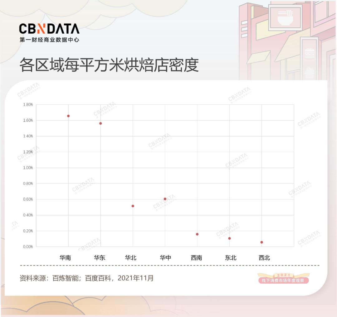 我国华南和华东地区的烘焙行业较为发达,根据百炼智能提供的烘焙门店分布数据,目前在中国七个区划中华南和华东地区每平方米的门店密度最大,华南和华东地区也是烘焙品牌的“必争之地”,但在2021年部分烘焙品牌将主战场布局到了华中和华北地区。