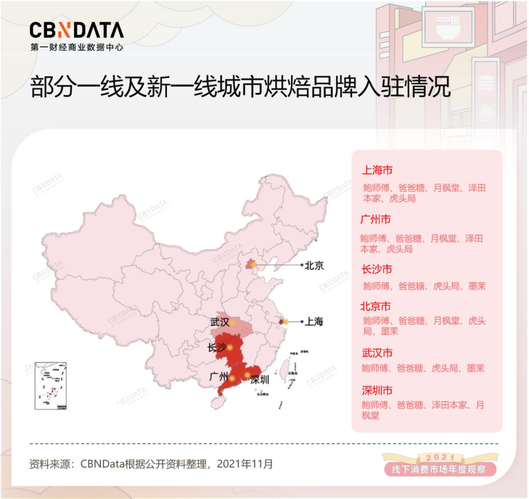 新烘焙品牌对SKU的选择和创新很大程度上弱化了产品口味可能带来的地域限制。在2021年拿到融资的品牌中,诞生于北京的鲍师傅目前已经覆盖了华东、华中、华南、西南等全国40个城市。墨茉和虎头局除了集中在长沙“大本营”的建设,也布局了华东、华南地区,从广州起家的泽田本家除了华南地区的深圳,华东地区的上海、杭州成为了其重要的市场。此外,接受加盟的月枫堂和爸爸糖则覆盖了更多的区域,月枫堂目前已经在全国20余省市开设门店,爸爸糖的门店已经覆盖全国92个城市,新现制烘焙品牌们表现出了极强的跨地域能力。