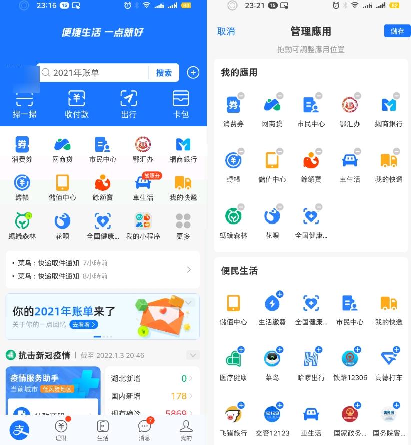 综上来看,也就是支付宝把首页交给用户自定义了,每一个用户首页小程序应用是“千人千面”的,比如我自己就把全国健康码放在这个位置,出门去哪里都会直接打开支付宝用绿码做通关文牒。