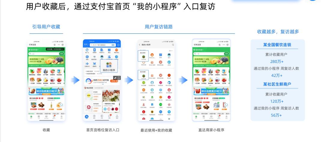 首先,具体到支付宝小程序留存,平台开放的“搜索-收藏”,对商家就是可以用来做用户留存的重要产品设计。