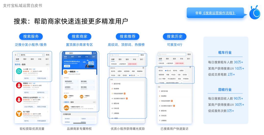 搜索框作为一个入口,以收藏功能+发券功能为重要数字工具,结合生活号内容构建的用户互动阵地,支付宝构建出一个极具代表性的链路单位:搜索——小程序交易或者服务——收藏——生活号展示——小程序服务。