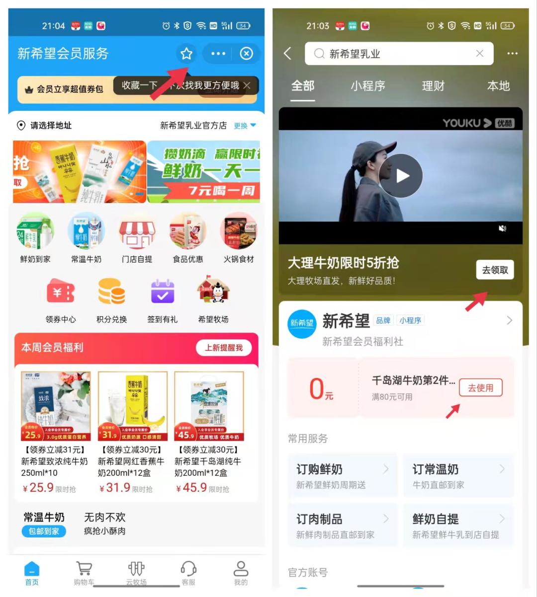 搜索是新用户通过支付宝首页一键获取商家服务的最短路径。首先商家可以通过私域运营,对自己的搜索关键词,结果页做精细化的设计。还是以新希望乳业为例,经过新希望的“装修”,它的搜索结果页同时兼备商家生活号宣传视频、领券能力、小程序内细分服务和各类阵地入口四大板块,就像为消费者一个完整展示品牌的“橱窗”服务能力。毫无疑问,会让新用户使用服务有更好的体验,一步就对商家的品牌调性和服务有全面的了解。