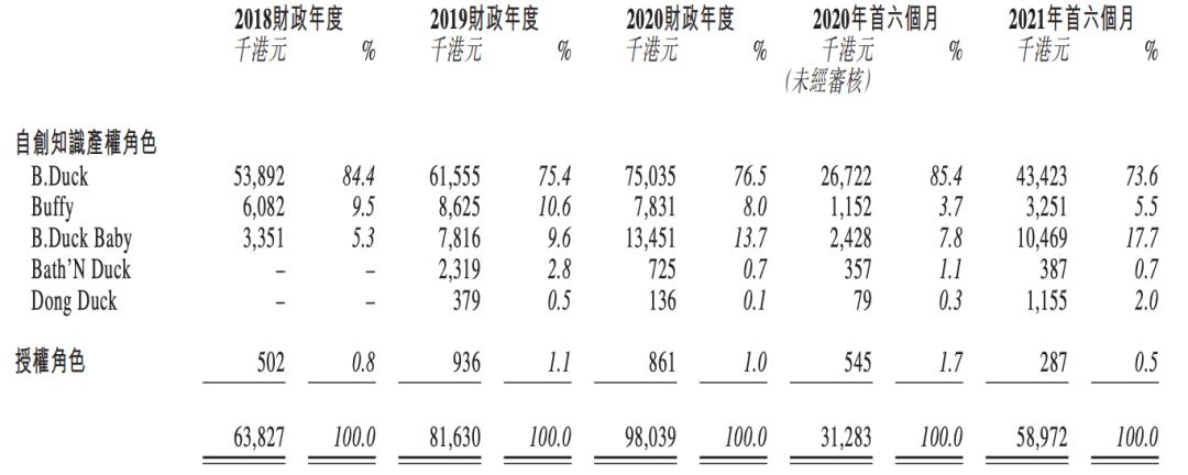 根据招股书,2018到2020财年,B.Duck家族占IP授权业务的99.2%、98.9%、99.0%,到2021财年上半年进一步达到99.5%。而B.Duck家族中,又以B.Duck小黄鸭为核心。