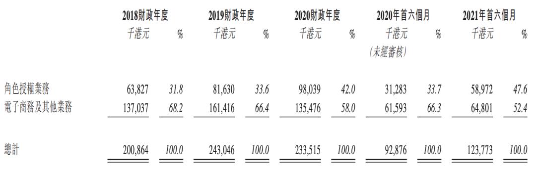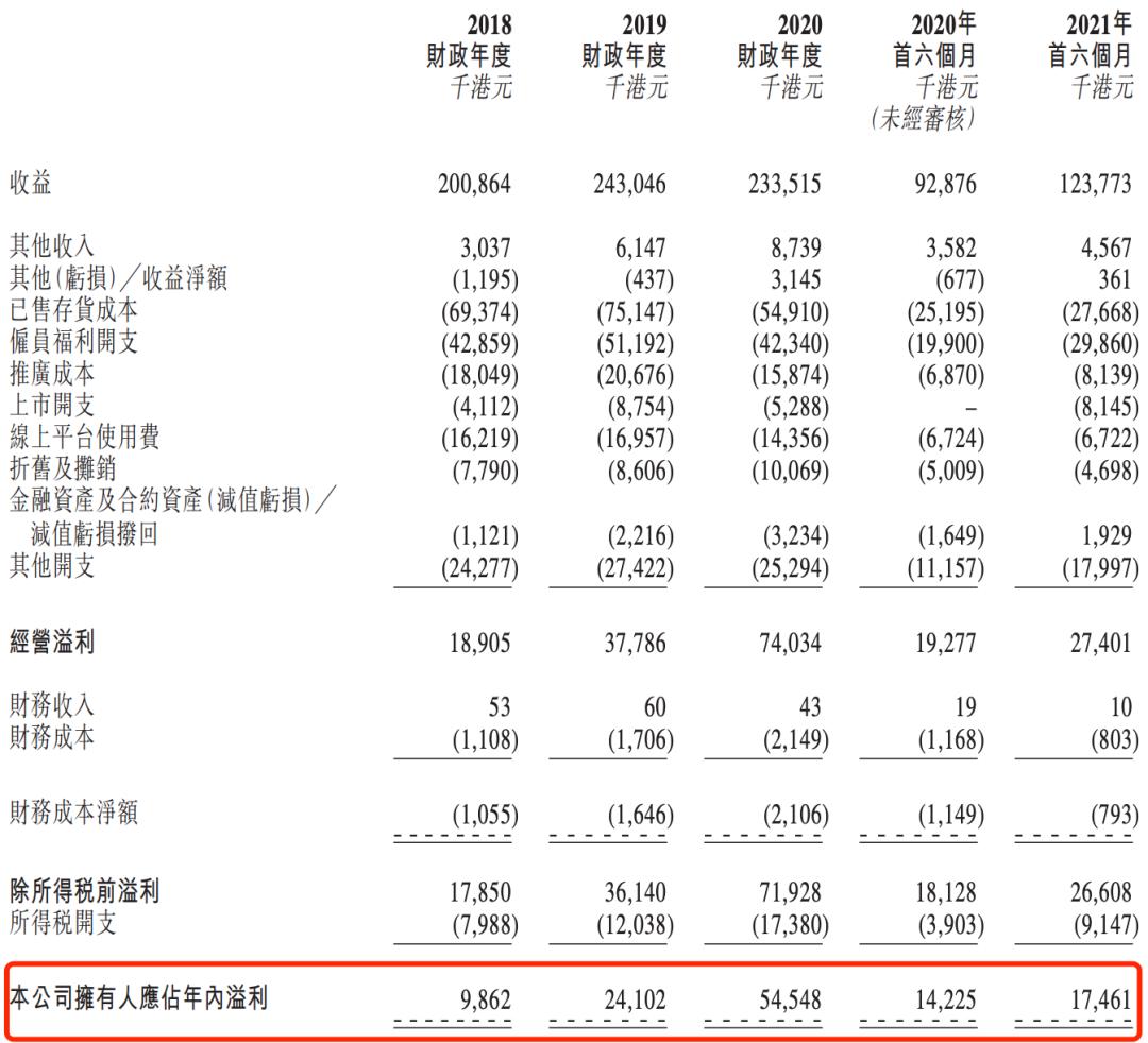 IP授权收入的急速增长,为德盈控股在疫情下带来了相对稳定的业绩。其在2018-2020财年的营收分别为2.01亿、2.43亿、2.34亿港元,2021财年上半年的营收为则为1.24亿港元,相较2020财年同期的0.93亿港元增长33.3%,在2020年的增长下降之后,恢复情况良好。