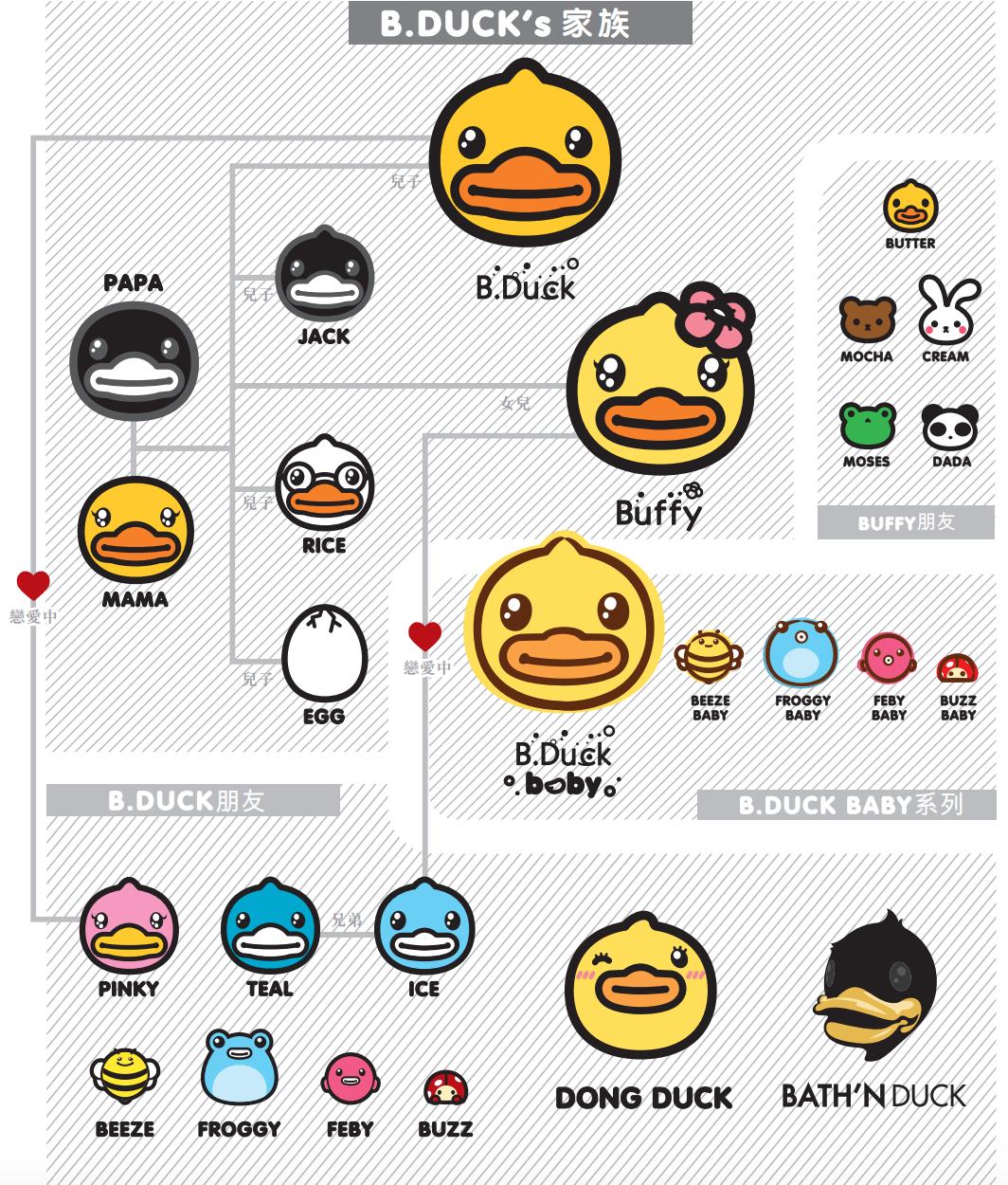 截至2020年末,德盈控股创作了多个角色,主要包括小黄鸭B.Duck、小黄鸭妹妹Buffy、小小黄鸭B.Duck Baby、为周冬雨创作的DongDuck,还有黑鸭子Bath’N Duck。德盈控股还表示,将于2023年推出新角色Buffy朋友系列“Cream、Mocha、Moses、DaDa及Butter”。