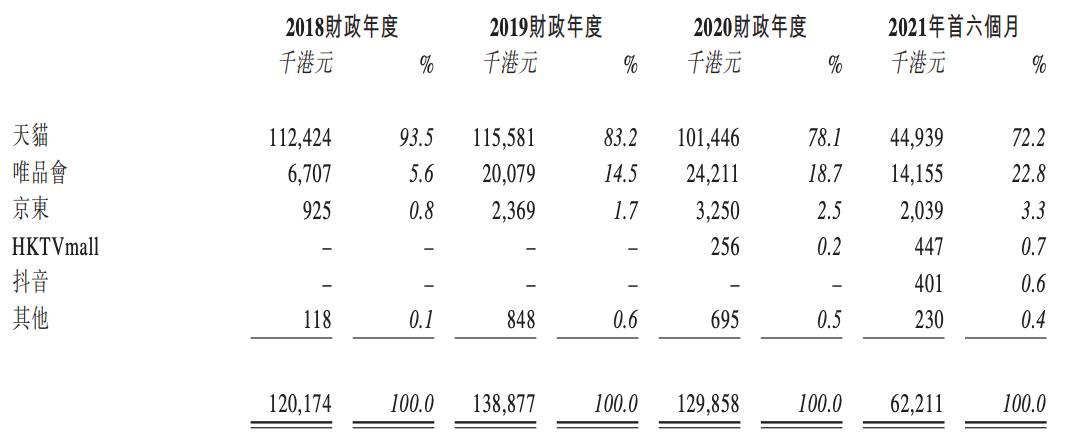 招股书还透露了一个不好的信息,小黄鸭的主力渠道一直是天猫,截至2021财年上半年,占比依然超过72%。