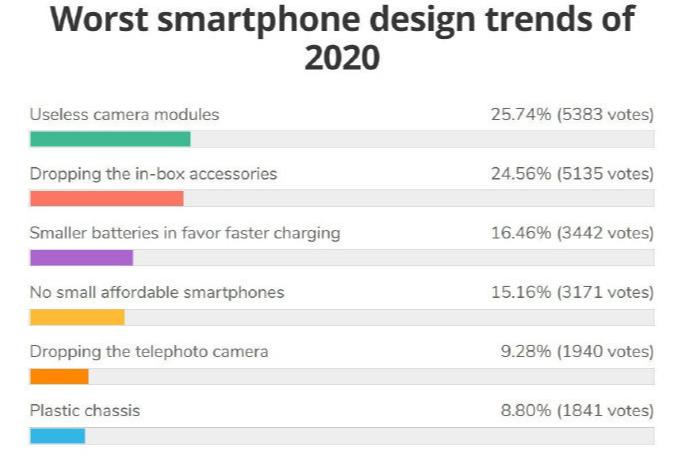 根据国外媒体GSMarena的投票结果显示,凑数镜头成了今年手机中最令人深恶痛绝的设计,所谓的ToF镜头、AI传感器和微距大部分在手机成像中起到的作用微乎其微,即使不搭载这些凑数镜头,手机的影像系统也能保证正常工作,厂商为了噱头无所不用其极,成为了这个行业中的普遍行为。
