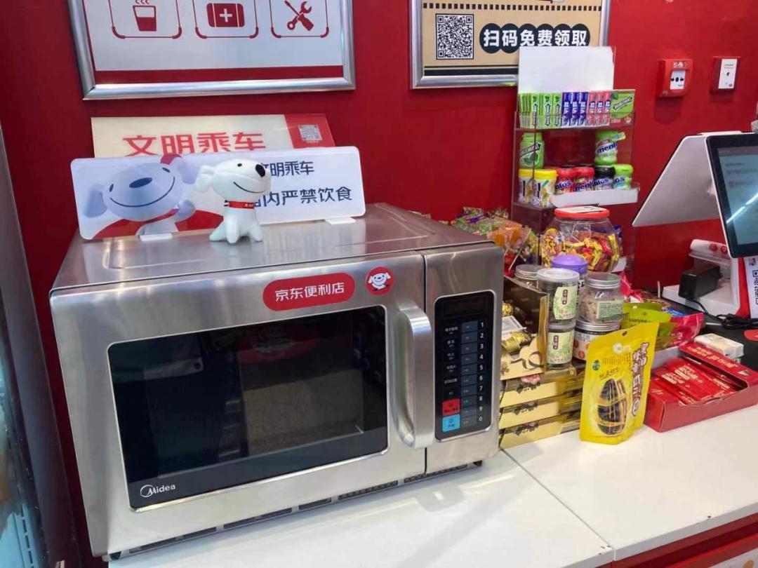 值得注意的是,京东便利店的冷藏区,配备了大量加热即食类食品,如三明治等,且价格基本与地上便利店一致。与此同时,店内的收银区域还放置了微波炉,以方便消费者使用。