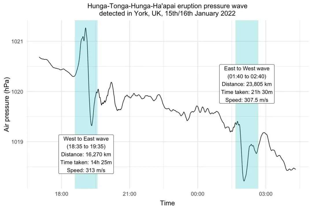 包括新西兰、澳大利亚、美国和英国的地震台都记录到了火山喷发产生的气压激增,并观察到了两次冲击波。